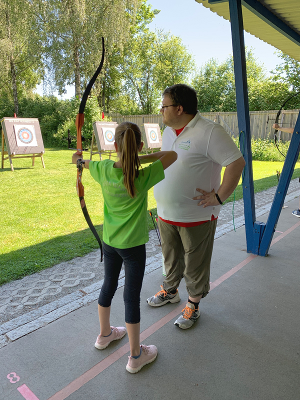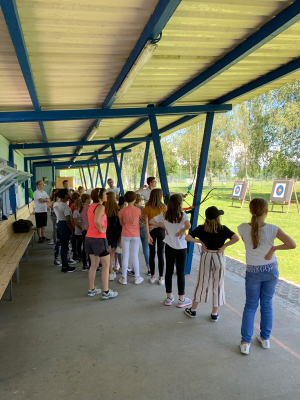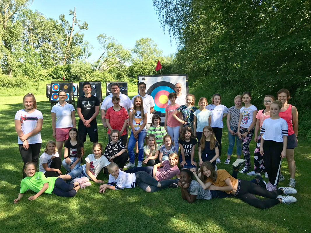 Auch im diesem Schuljahr stand Bogenschießen wieder auf ihrem Programm: Am Montag, den 03. Juni traf die Klasse bei strahlendem Sonnenschein ein und konnte es kaum erwarten bis es nach dem gemeinsamen Aufwärmen und den Trockenübungen am Theraband dann an Pfeil und Bogen ging!