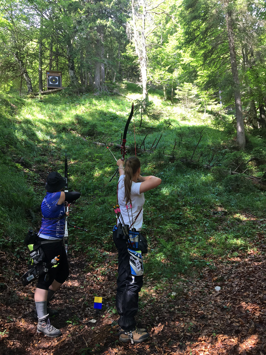 Am zweiten Tag ging es dann in den bekannten Parcours, dort stehen die Scheiben zwischen 10 und 60 Metern mit angegebenen Entfernungen. Bei blauem Himmel und Sonnenschein mussten die 3 Natternberger zur ersten von 24 Scheiben bereits über 50 Höhenmeter erklimmen. Aufgrund der kleineren Auflagen, beziehungsweise der weiter entfernteren Scheiben, sind die Ergebnisse im bekannten Parcours meist ein wenig niedriger. Zusätzlich zerrten die Temperaturen von über 30 Grad und der schwierige Parcours an den Kräften der Schützen.