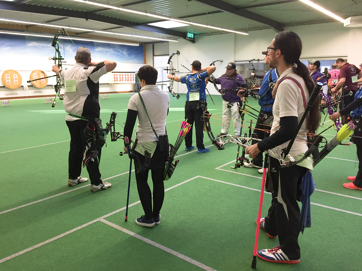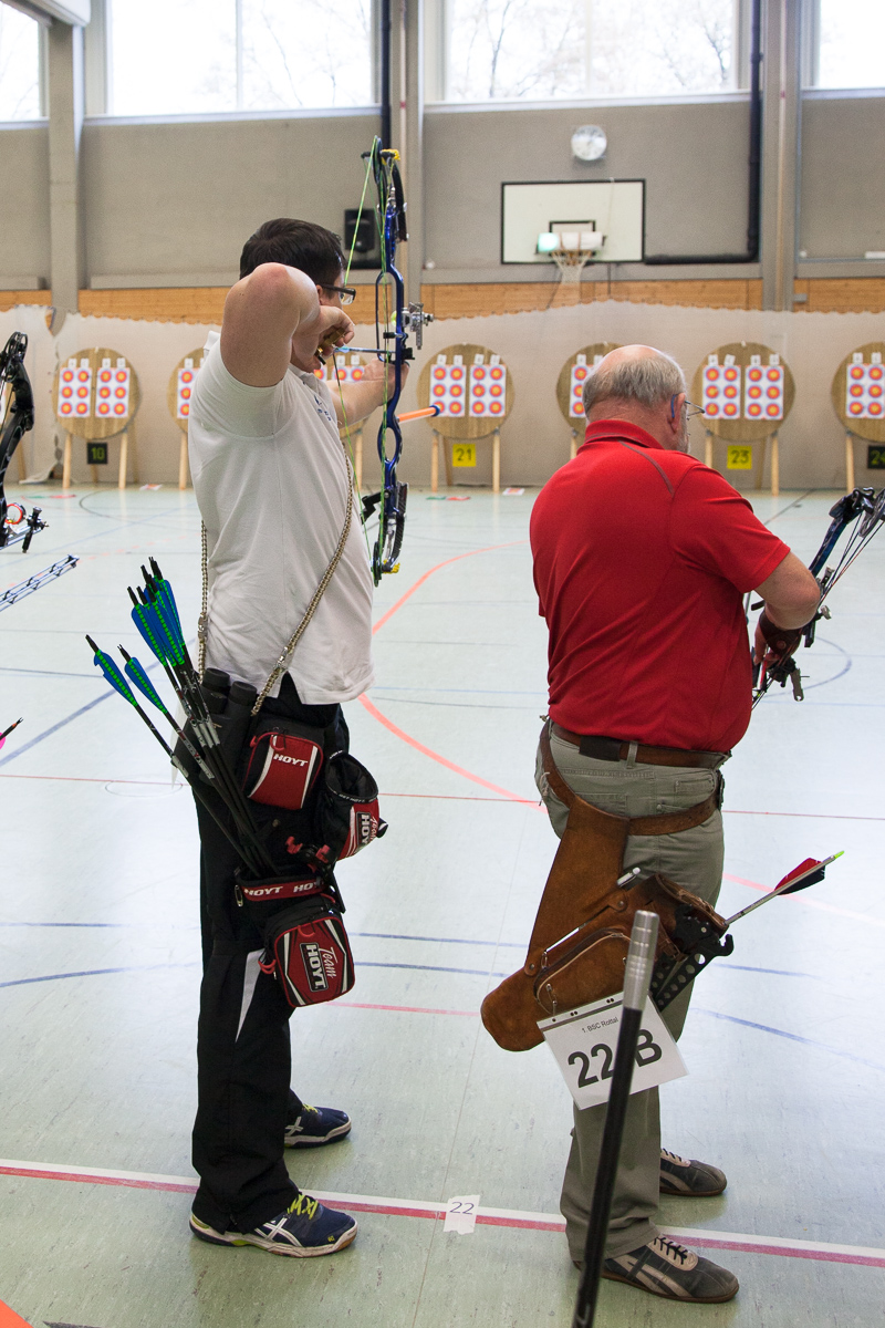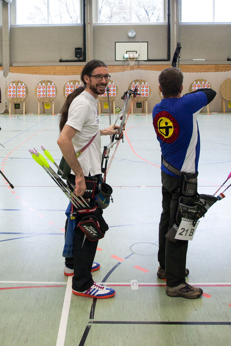 Pünktlich zur Hallenöffnung um 7 Uhr waren die beiden dann auch in Hof. Michael hatte also in aller Ruhe Zeit um seine Startnummer abzuholen, seinen Bogen aufzubauen, in der Bogenkontrolle checken zu lassen und sich umfangreich aufzuwärmen, bevor die Meisterschaft um 9 Uhr startete.