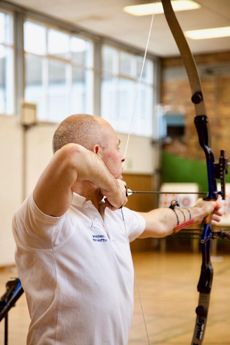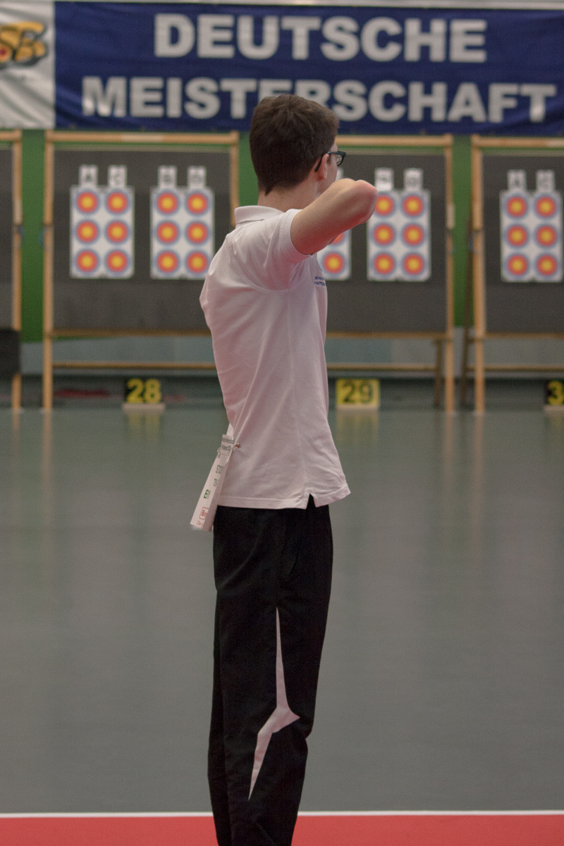 Nachdem die Trainingspfeile zu Beginn sehr gut liefen, verpatze David dann leider gleich in der allerersten Passe der Wertungspfeile etwas: Den dritten Schuss wollte er noch einmal absetzen und neu aufbauen, aber ihm kam der Pfeil aus und landete auf der Scheibe knapp neben der Auflage. Damit startete David auf Platz 38 von 40 in den Wettkampftag.