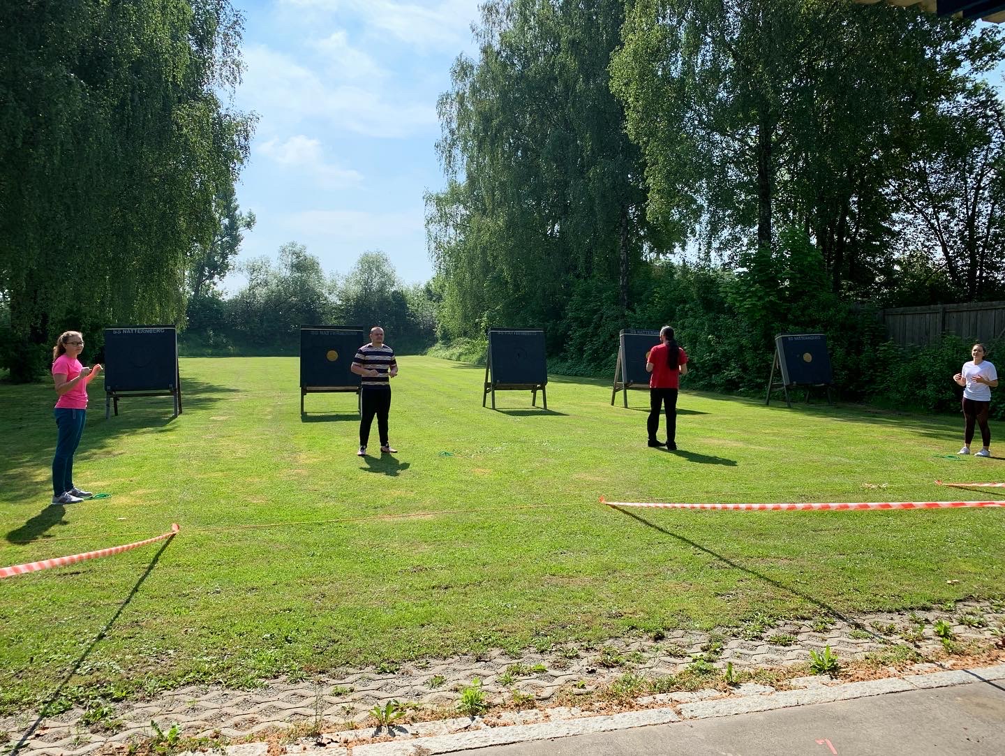 Nach dem Aufwärmen und einem kurzen Einschießen wurde als erstes auf ein bewegliches Ziel geschossen, es galt eine vorbeifahrende Scheibe innerhalb zweier Pfosten zu treffen. Als nächstes konnten die Bögen dann erst einmal zur Seite gelegt werden, hier mussten die Pfeile per Hand in abgesteckte Formen auf dem Boden geworfen werden. Dann war Teamwork gefragt, in Zweierteams wurde gegeneinander TicTaToe gespielt. Ein Schütze zog dabei den Bogen aus, während der Partner ihn hielt und zielte. Anschließend galt es in 6er-Teams möglichst schnell eine Auflage umzudrehen auf der man gleichzeitig aber stehen bleiben musste.