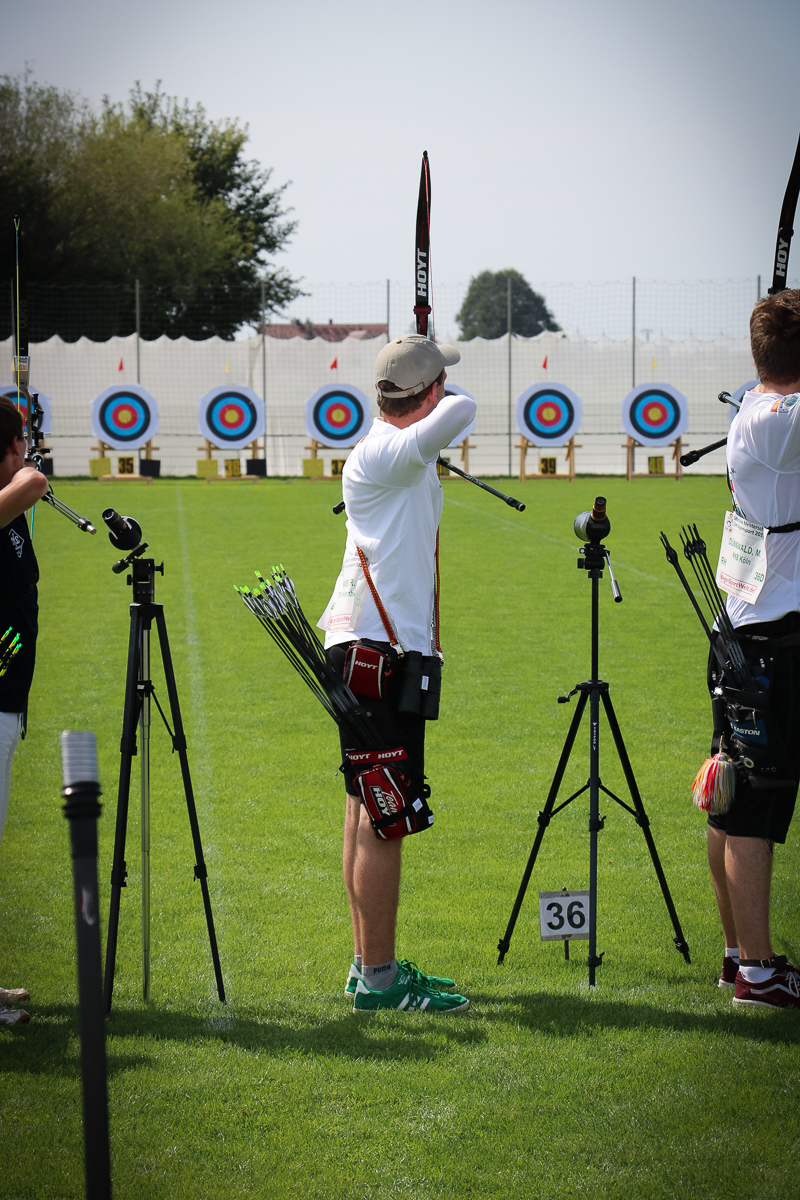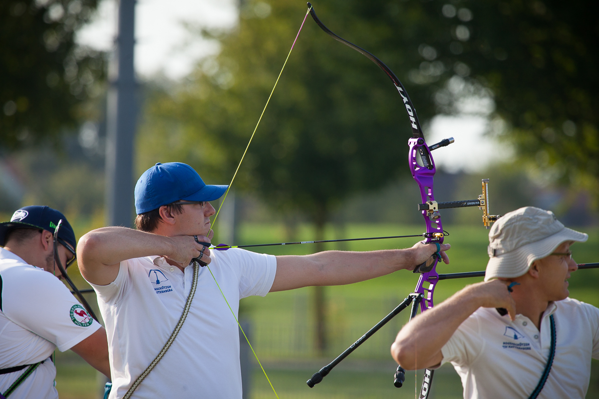 Am Samstag waren dann die Recurver an der Reihe. Josef und Dieter legten beide eine hervorragende erste Runde hin. Mit 326 bzw. 317 Ringen konnten sich beide weit vorne positionieren und hatten einen sehr guten Ausgangpunkt für die zweite Hälfte der Qualifikationsrunde. Leider konnten beide bei der aufkommenden Mittagshitze diese starken Positionen nicht ganz verteidigen. Josef belegte schlussendlich dennoch einen sehr guten 12. Rang und qualifizierte sich somit für das Achtelfinale. Dort durfte er gegen Carlo Schmitz, einem Mitglied des Nationalkaders, antreten. Zwar musste sich Josef seinem Gegner geschlagen geben, dennoch lieferten sich beide ein spannendes Match. Auch Dieter konnte sich über seinen 24. Platz freuen. Mit 68 Teilnehmern in ihrer Klasse konnten beide ein sehr gutes Statement setzen.